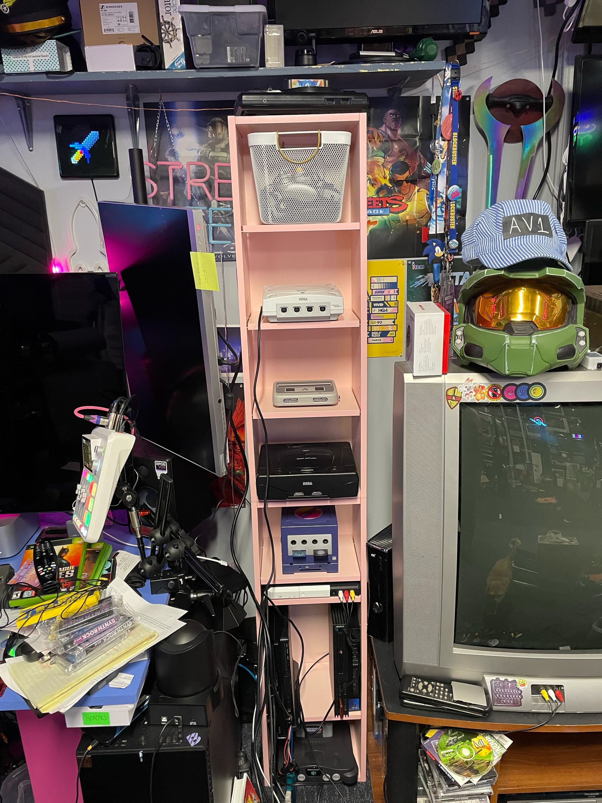 I built this “Console Tower of Power” at the end of 2023 and start of 2024. I found stacked shelves on sale that were similar to some I had as a teenager, they came in a splash of color for my space, and I needed something to get my consoles over to my desk for streaming and capture.