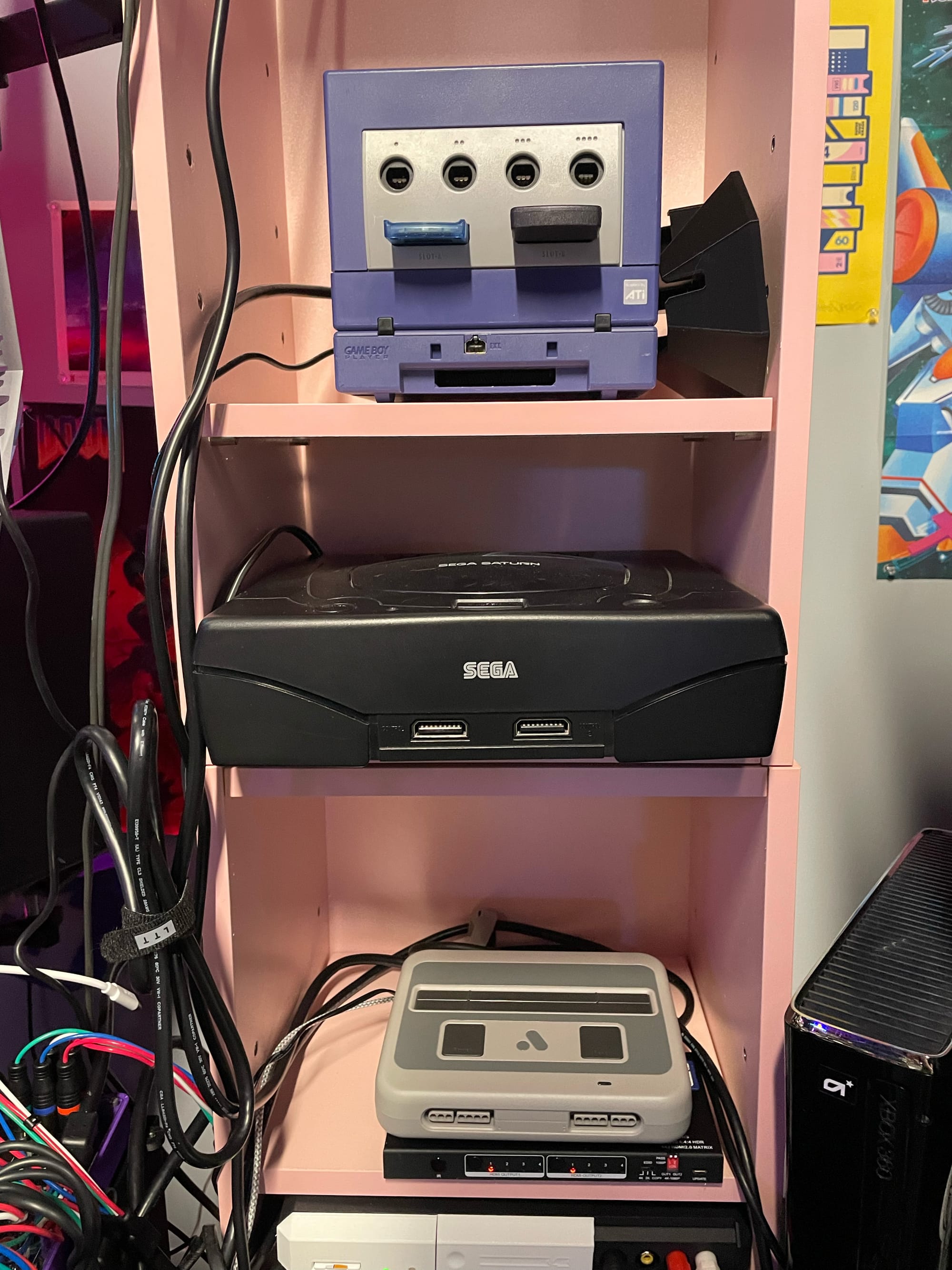 I stacked the shelves, wired up the consoles. GCompSW for the analog routing, RetroTINK 4K for the scaling to capture. The switch also split the signal over to my big 36” CRT next to the setup for any 480i/240p games to be played there.