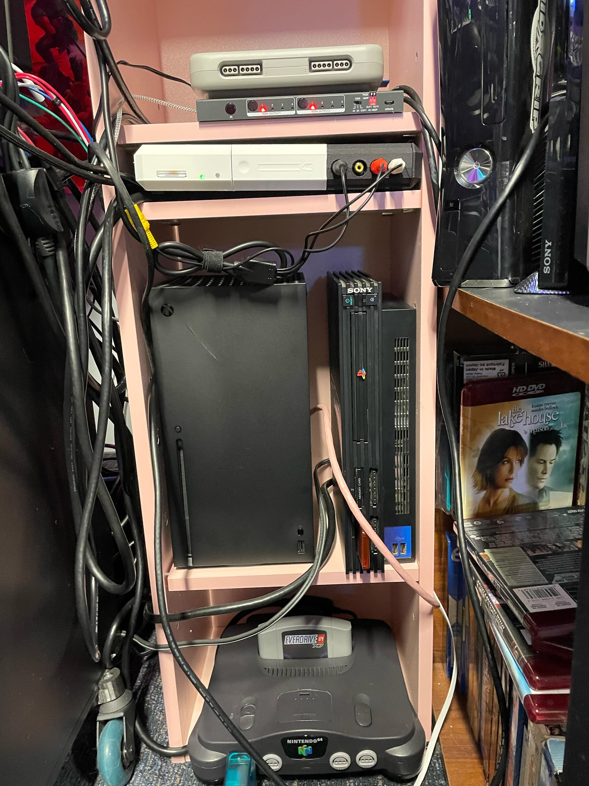 Honestly, this kind of shelving sucks for console routing. Perhaps it would be better with holes cut in the back for cables to run to – but if you’re not committed to permanent modification, wires going in and out of the cubbies isn’t fun, the shelves aren’t exactly sized well for most consoles, and none of them are going to have any good airflow (mostly a problem for the PlayStation 2 and Xbox and newer). But I did it anyway, as I had this exact setup in 2006-2008 and thought it was awesome, and I didn’t have the space or spoons to figure out a better solution.